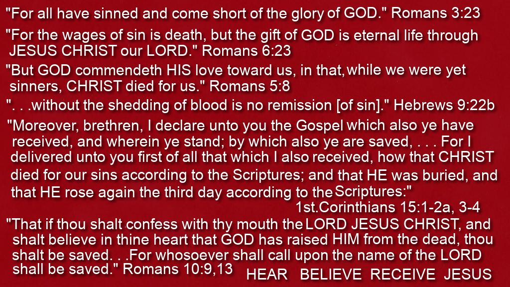 LORD, I know that I am a sinner, and I believe YOU died and rose again for me. I am trusting YOU to forgive me. Come into my heart and save me. Help me to live for YOU always. In JESUS' name I pray, AMEN.